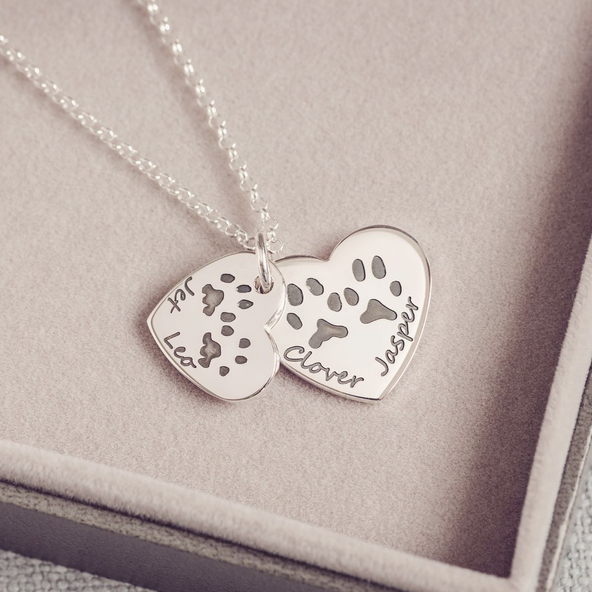 Pawprint Descending Heart Necklace, Four Prints And Four Names